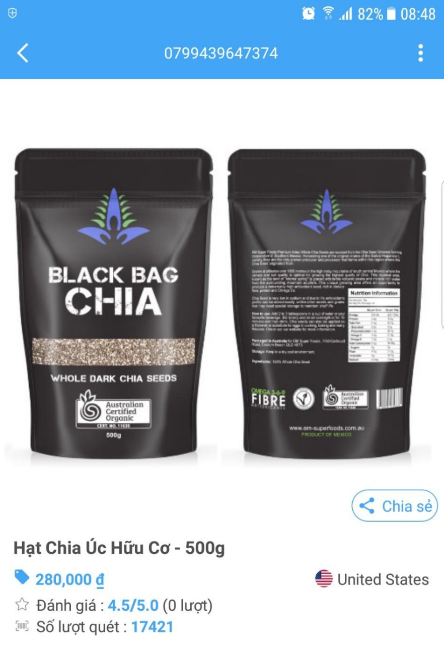 Hạt chia black bag 500g có thành phần dinh dưỡng cao, là giải pháp hoàn hảo giúp bổ sung dưỡng chất và bảo vệ sức khỏe tối ưu. Không mùi, không vị, rất dễ ăn, thích hợp với mọi đối tượng. Chiết xuất tự nhiên, không pha trộn thêm các chất phụ gia gây nguy hại đến sức khỏe. Thiết kế tiện lợi, dễ dàng sử dụng và bảo quản. - Thành phần dinh dưỡng của hạt chia đen của Úc Black Bag Chia 500g Giàu Omega-3 và Omega-6 giúp tăng cường sức đề kháng, phát triển trí não và bảo vệ sức khỏe tim mạch. Công dụng của hạt chia đen giúp bổ sung protein, nâng cao khả năng miễn dịch, cung cấp năng lượng, thúc đẩy phát triển thể chất và trí não toàn diện. Hàm lượng chất xơ cao giúp bộ máy tiêu hóa hoạt động tốt, ngăn ngừa các bệnh về đường ruột, đặc biệt là cải thiện chứng táo bón. Hạt chia đen úc cung cấp Canxi thúc đẩy phát triển chiều cao và giúp răng lợi được chắc khỏe. Bổ sung sắt giúp nâng cao sức khỏe và ngăn ngừa tình trạng thiếu máu. Chứa nhiều vitamin PP tạo cảm giác no lâu, giúp giảm lượng cholesterol, duy trì vóc dáng cân đối.