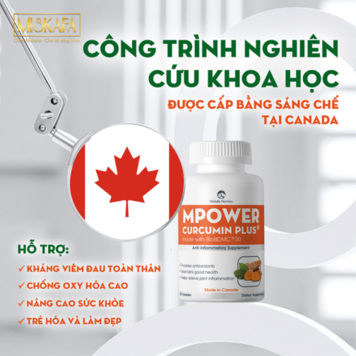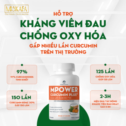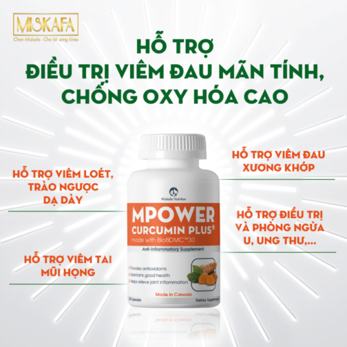 Mpower Curcumin Plus là Viên uống hỗ trợ chống oxy hóa, kháng viêm đau mãn tính toàn thân được ứng dụng công nghệ BioBMDC™30 được cấp bằng sáng chế tại Canada. Nâng cao hàm lượng curcumin BDMC (curcumin mạnh nhất) lên đến 30% gấp gần 60-150 lần curucmin trên thị trường.