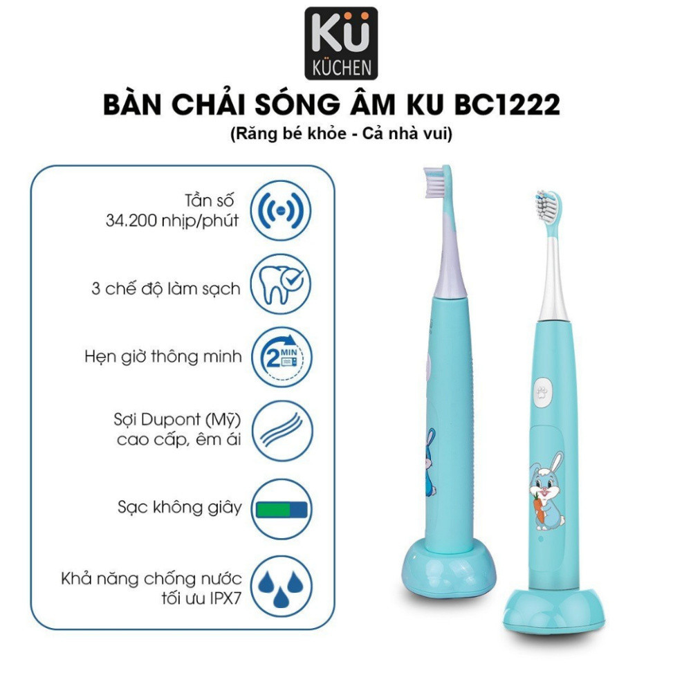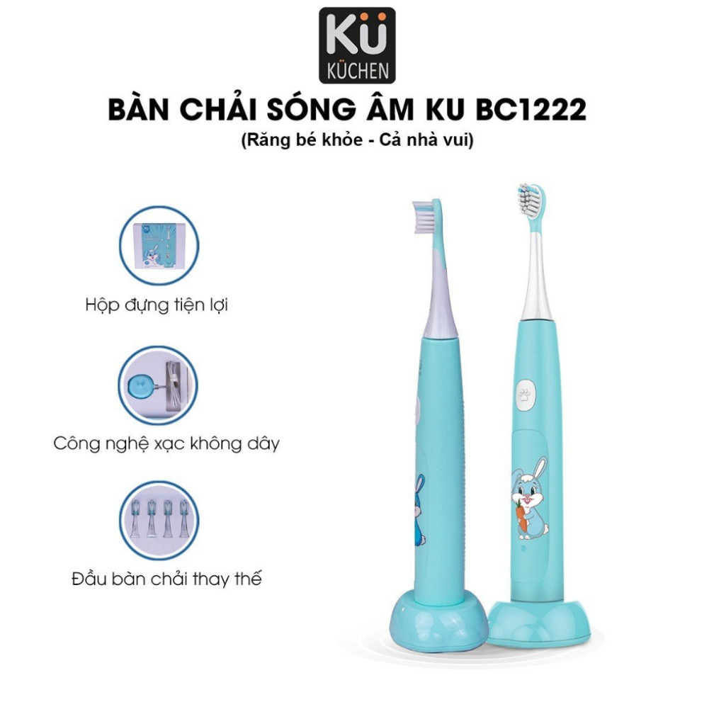 Bàn chải đánh răng điện dành cho bé/ trẻ em sóng âm cao cấp-3 chế độ làm sạch-sạc không dây-chống nước Kuchen KU BC1222