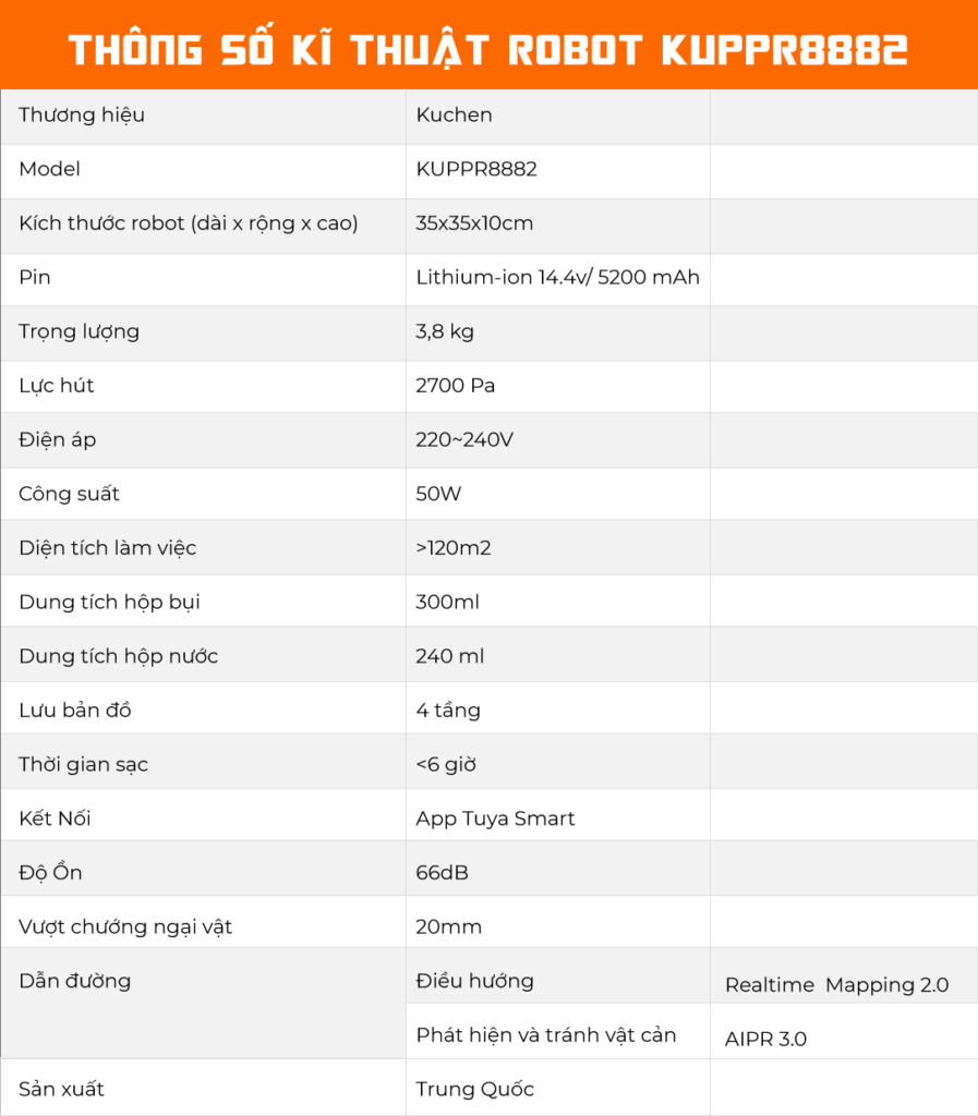 Robot hút bụi và lau nhà thế hệ mới hiện đại và thông minh gia tăng công suất làm sạch, pin 5200mAh KUCHEN KU PPR8882