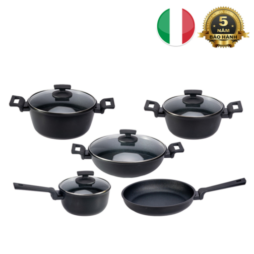 Set Bộ 5 nồi chảo Ý (Italy) chống dính, bên trong phủ kim cương, bên ngoài phủ men sứ KUCHEN Diamante